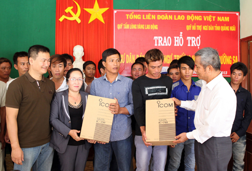 Chủ toạ Tổng LĐLĐVN Đặng Ngọc Tùng trao tặng thiết bị liên lạc ICOM cho ngư dân xã An Vĩnh, huyện Lý Sơn, Quảng Ngãi. Org. Ông Hoàng Vĩnh Bảo, Cục trưởng Cục Phát thanh-Truyền hình, Bộ thông báo và Truyền thông, cho biết thêm: nhàng nhàng mỗi năm Việt Nam chịu ảnh hưởng của 10 cơn bão, 5 đợt áp thấp nhiệt đới, trong đó nhiều cơn bão cường độ mạnh và ảnh hưởng trực tiếp đến nước ta gây thiệt hại nặng nề về người và tài sản.